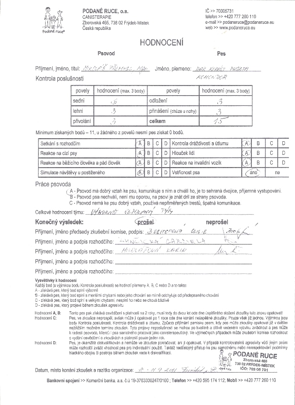hodnocení budoucích canisterapeutických týmů. O to náročnější pro nás bylo nastoupit před komisi v roli